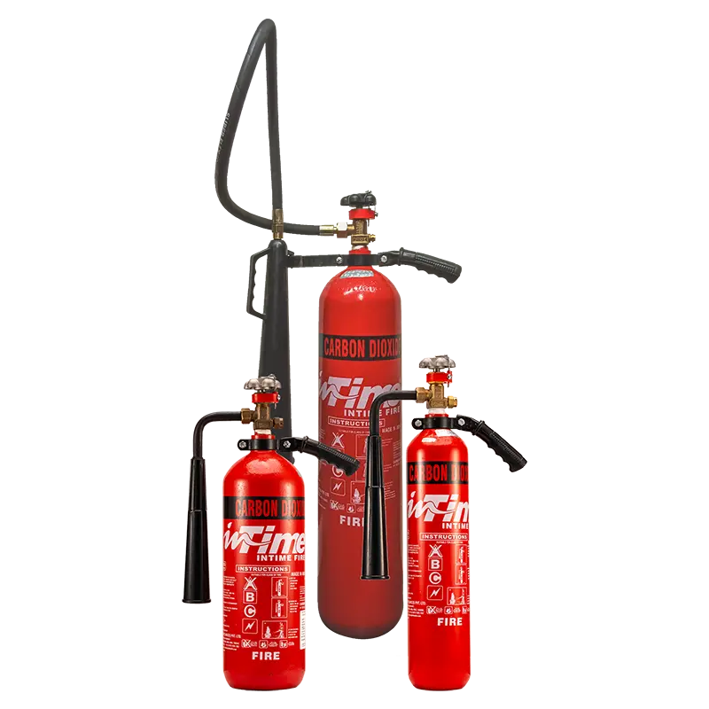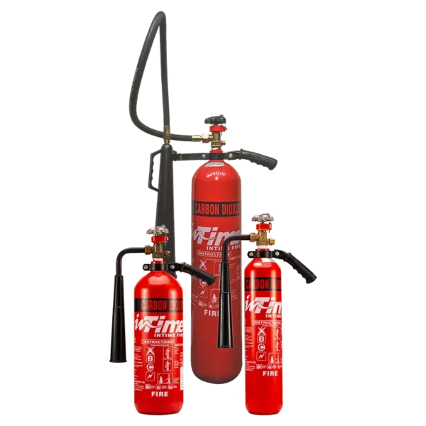 The INTIME CO2 fire extinguisher is manufactured with a high-pressure aluminium (6061 alloy) body, conforming to IS 15683:2018 and ISI standards, with CO2 gas as per IS 15222 and PESO approval. It features a controllable wheel-type valve (IS 3224), non-conductive horn, discharge hose, siphon tube, locking mechanism, carrying handle, and bracket. Externally spray-painted in IS 5 shade 538/536, it operates between –20°C to +55°C and is suitable for Class B, C, and electrical fires. Instructions are provided on a waterproof silk-printed screen with a QR code for traceability.