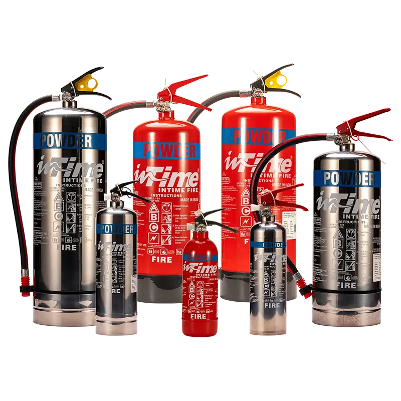 INTIME dry chemical powder fire extinguishers are ISI marked and compliant with IS 15683:2018, available in stored pressure variants with MAP powder concentrations of 40%, 50%, or 90% per IS 4308:2019, and pressurised with nitrogen. Offered in cold deep-drawn steel, aluminium, or SS304 stainless steel bodies, each extinguisher features a squeeze-grip valve, pressure gauge, discharge hose, siphon tube, locking mechanism, neck ring, and mounting bracket. Cylinders are internally PU coated and externally epoxy polyester powder coated in IS 5 shade 538/536, with a minimum 10 mm skirt for durability. Designed for Class A, B, and C fires (based on MAP grade), they operate reliably between –20°C and +60°C (–30°C for steel body), and include waterproof silk-printed instructions with a QR code for traceability, meeting IS 15683:2018 standards for fire rating, discharge time, and range.