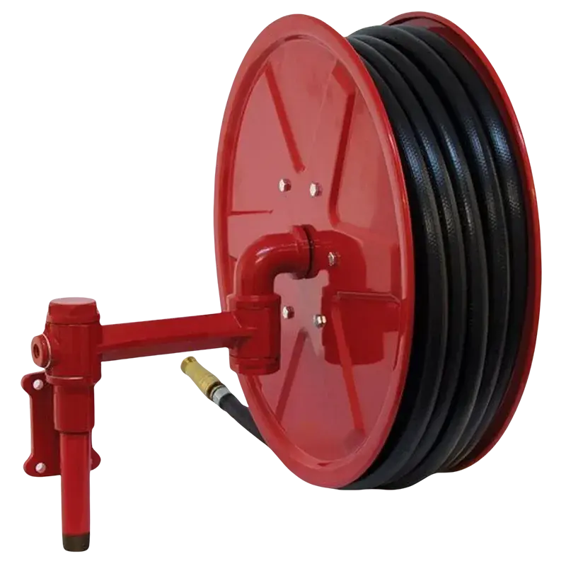 Durable hose reel drum available in 19mm and 25mm sizes, constructed from M.S. 18 SWG with thermoplastic or rubber braided hose. Compliant with IS: 884 standards, this reel features threaded inlets and optional shut-off or jet and spray nozzles, ensuring optimal firefighting efficiency. BIS (ISI) marked for hose reel hose.
