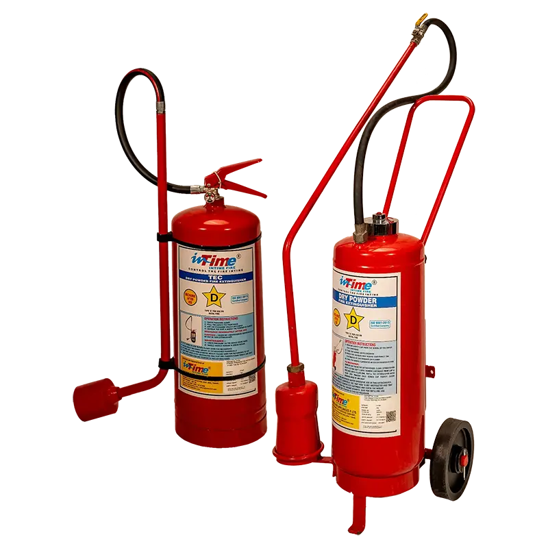 Advanced Metal Trolley Mounted Stored Pressure TEC Powder Fire Extinguishers, designed to provide superior fire protection for Class D fires involving combustible metals. These extinguishers feature a special TEC powder, a highly effective agent for extinguishing metal fires. The powder is stored under pressure in a CO2 gas cartridge, ensuring reliable and efficient discharge. The extinguisher’s design includes a controllable discharge mechanism, braided/rubber discharge hose, applicator tube, dome nozzle, siphon tube, locking arrangement, and a trolley for easy mobility. Constructed with a durable cylindrical body made of welded cold deep-drawn steel, these extinguishers are built to last. The extinguisher’s design includes a bottom end cylindrical skirt, ensuring stability and preventing tipping. For added protection, the extinguisher is coated with epoxy polyester powder and PU coating, ensuring resistance to corrosion and wear. Additionally, the extinguisher features a waterproof screen/silk printing with instructions and a QR code for easy reference. Available in various capacities (4 kg, 6 kg, and 9 kg), these extinguishers are ideal for industrial settings where metal fires are a potential hazard. The extinguishers are designed to operate in temperatures ranging from -20°C to +60°C and meet the requirements of IS 11833. Each extinguisher is CE-certified, ensuring quality and safety.